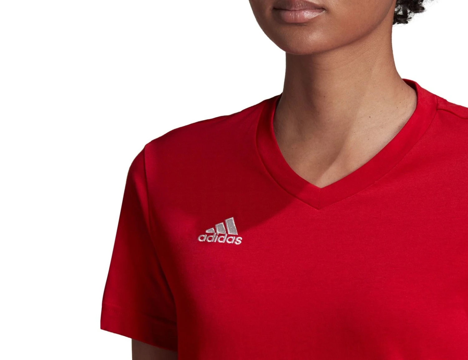 The cotton adidas Entrada 22 T-shirt for women, in the color Team Power Red, has a soft feel and can be used for football or for leisure. The shirt has a regular fit, a V-neckline and an embroidered adidas Badge of Sports logo on the front. This T-shirt is part of the Better Cotton Initiative.
